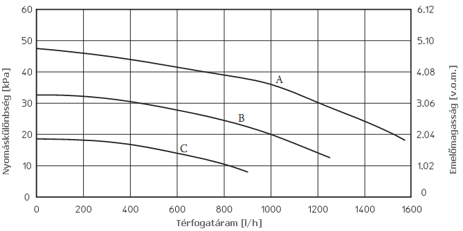 Direkt fűtési kör szivattyújának jelleggörbéje (gyárilag egy kör telepítve):